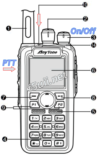 Turn off your AR-D868UV. Turn the unit back on with the volume control (rotary knob 3 below) by holding the PTT key and the upper orange key (10 below). The display remains off and the LED flashes red. The firmware is ready to load into your AT-D868UV.